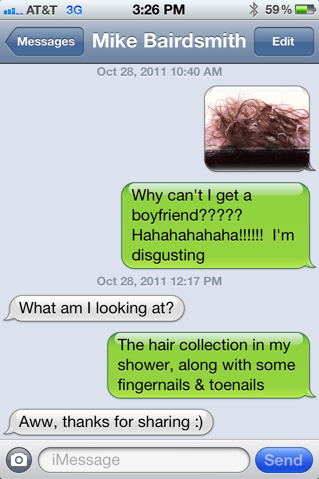 On my second date with the man who is now my boyfriend, I told him about sending Mike the above text. He laughed with me as I told the story – as opposed to standing up and walking out of the pub, never to be seen again. Shortly after that he invited me to Hawaii with him, so I don’t think he was put-off by my unladylike behavior. Still, when we were new, I was careful to throw away my hair pile. After my shower I’d dispose of whatever I’d collected. But then I would sit with him over toast and tea, absentmindedly finger-combing my wet hair and letting the strands that came out drift onto his hardwood floor while we talked. Or while driving together, I’d roll down the window and let the hair that pulled free fly away in the breeze, as an offering to the birds for their nests. He never really seemed to notice, even when I forgot to remove the actual pile from either of our showers.