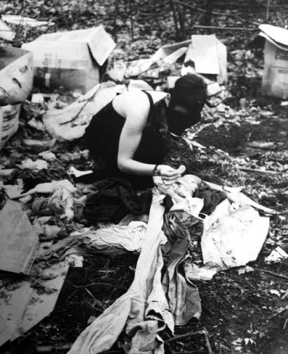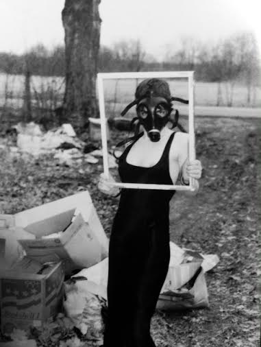One day we ventured outside and drove to the outskirts between city and country, where he wanted to do a photo shoot. I wore a gorgeous, inky black silk slip, and a gas mask. We found a pile of garbage in a rutted field, and I dug around in it, walked in the field, ran back and forth, while he took pictures and ignored passerby who slowed their cars when they saw me.
