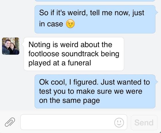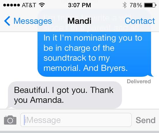 Is it weird that I’m pretty sure she got to work making my death soundtrack as soon as she got my text? I mean, she answered me as though it were absolutely going to happen. That’s cool, though. I appreciate knowing that she’s got my back, and no sad asses will be moping in chairs at my party.