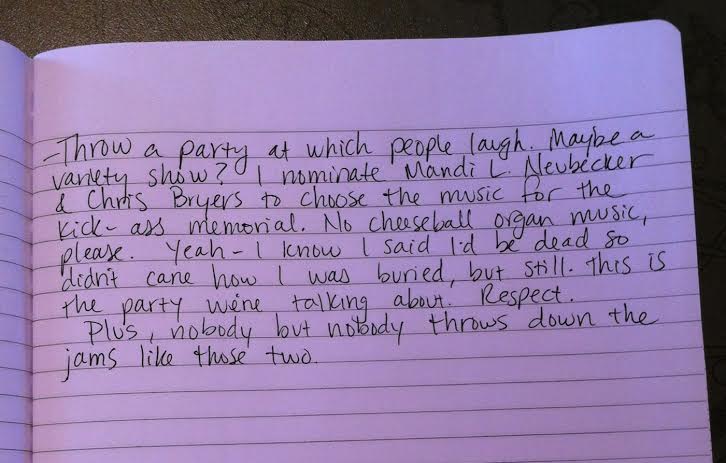 So, needless to say, I wrote a will. If you need it, it’s in my journal. The one that looks like many of my other journals, it’s black? Anyway, whatever. I’m sure if it’s a problem, my neighbor will find it for me and sort it all out. (Thanks Sara!)
