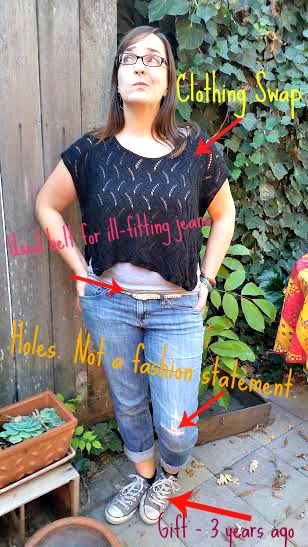 I’m still dressing in hand-me-downs, clothing swap scores, and whatever filler I can afford. See that weird half-sweater thing I’m wearing in the photo? I have no idea what that even is. I would never pick that out for myself. And yet, I wore it. Because shopping is a befuddling, frustrating experience for me which I am almost more averse to than trips to the DMV without an appointment on a Monday morning; sometimes this means wearing a weird half-sweater.