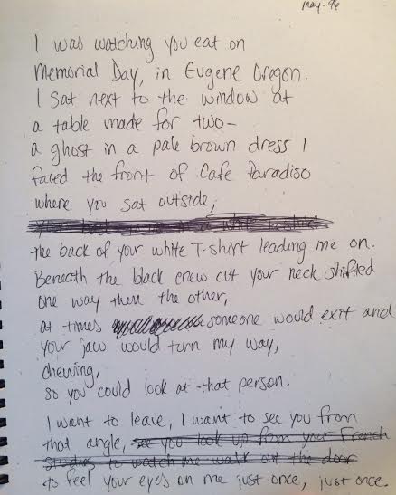 I’d met Cole two days earlier, on Memorial Day, at Cafe Paradiso in downtown Eugene. I’d come out West because my on again/off again boyfriend Tom was convinced he was meant to move to Eugene, and therefore I was convinced that I was meant to move there, too. After seeing ‘signs’ for the past several months as I drove around the grey snow-covered streets of Kalamazoo – a few Oregon licence plates, mostly – I’d bought a plane ticket so I could check the place out and in short order found myself sitting in that cafe, writing bad situational poetry in my decorative journal, watching people as they walked in or out.