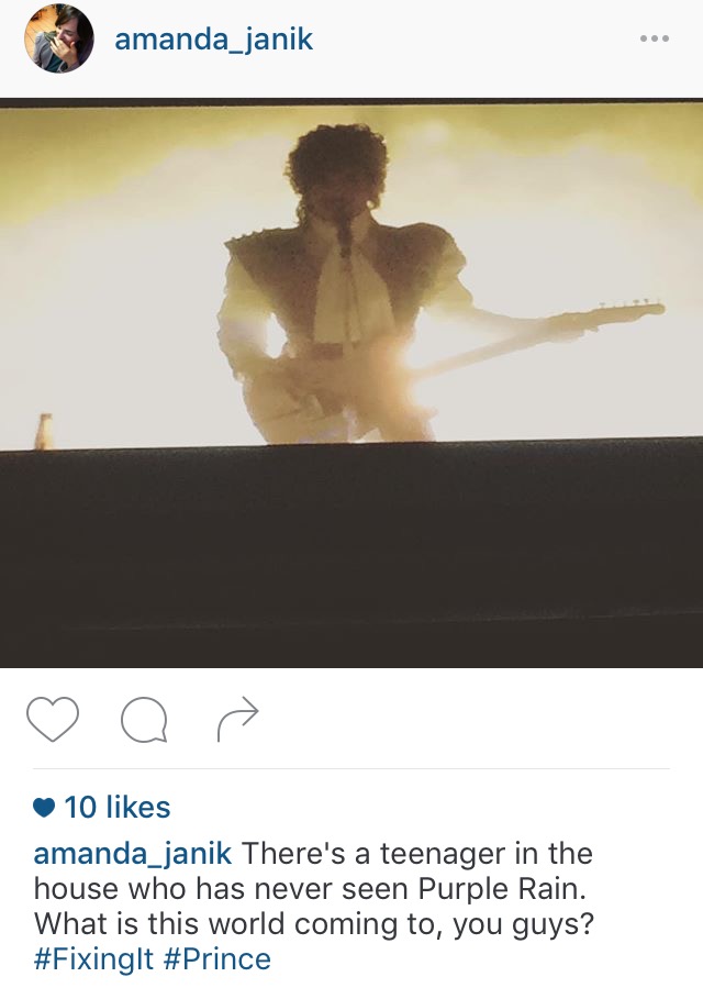 Two weeks ago today, I was hanging out with my boyfriend’s son, who is 17, and discovered that he’d never seen Purple Rain. After much trial and tribulation and hooking up cords to TV’s, we finally settled in with our popcorn, and pushed Play. He fell asleep before the movie ended, but I know it’s all in there, in his brain, because I sat watching until the very end, crying like I always do, and you can’t just not hear Prince when Prince is playing.