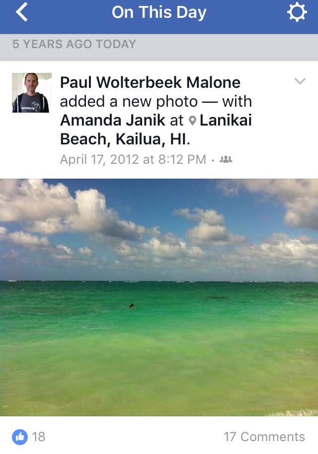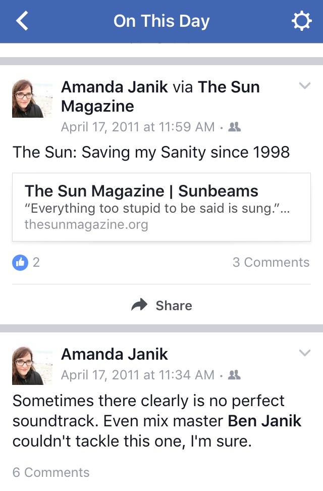 There is the thing Facebook does – the Memories. I look at it every day, and more often it is an emotionally masochistic act than a warm-fuzzy one. I notice myself doing an unconscious countdown around November. Now that my boyfriend Paulie and I have been together for less-than-six-but-more-than-five years, as the memories get closer to the day we met I start to think about how much it amazes me that I still really like him, a lot, after X many years. This is a positive memory.