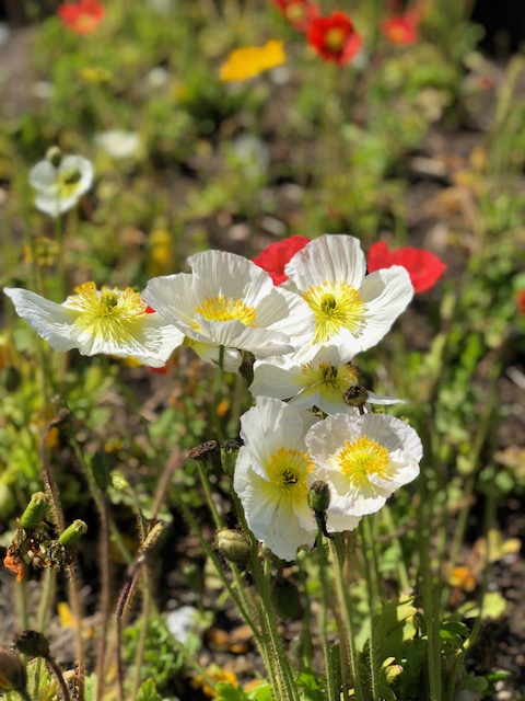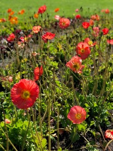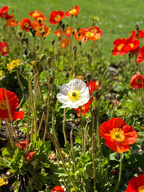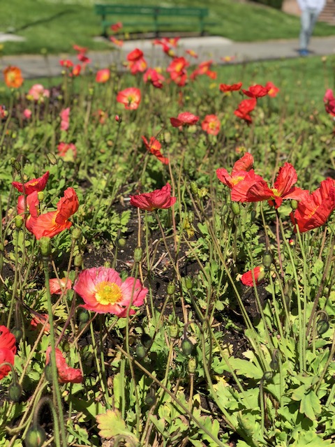 I smiled while I walked over the grass toward the poppies. I smiled while I took deep breaths of air. Each patch of flowers needed my full attention, and I wandered from one to the other, oohing and aahing, grinning like I was touched, taking pictures. I smiled as I walked toward a bench, sat on it, and just looked at the flowers. The wind blew my hair into my face; I brushed it away. I pulled the book I was reading out of my purse and read a chapter, smiling, glancing up from time to time to once again admire the colors and delicate folds in the wide, rounded petals. Each flower was a delight. It was a perfect ten minutes.